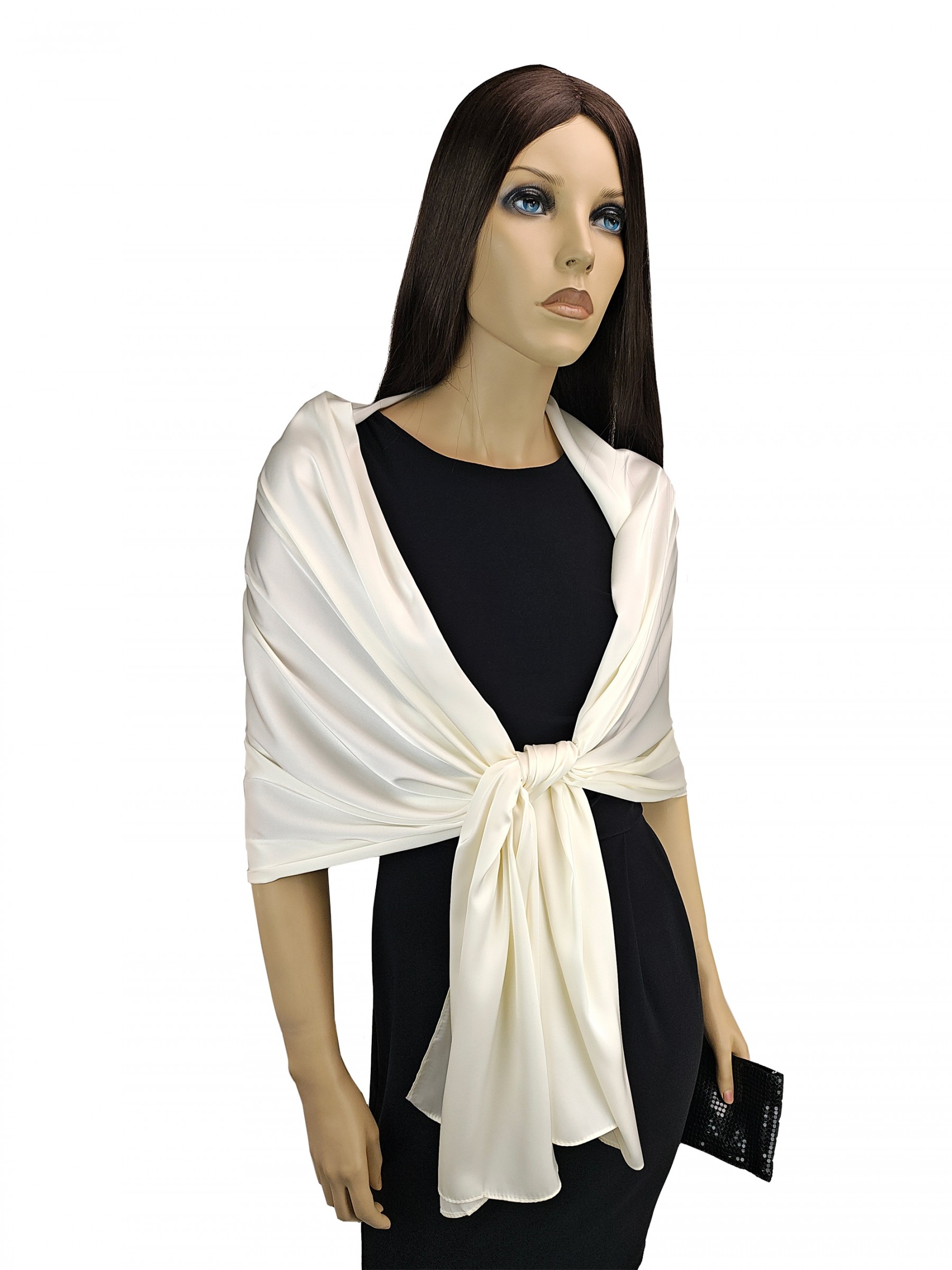 Poszukujesz elaganckiego satynowego szala do sukienki? W tym subtelnym szalu w odcieniu ecru będziesz wyglądała zjawiskowo, jest niezwykle elegancki i kobiecy. Otocz się satynowym blaskiem, który wspaniale podkreśli uroczysty charakter stylizacji.