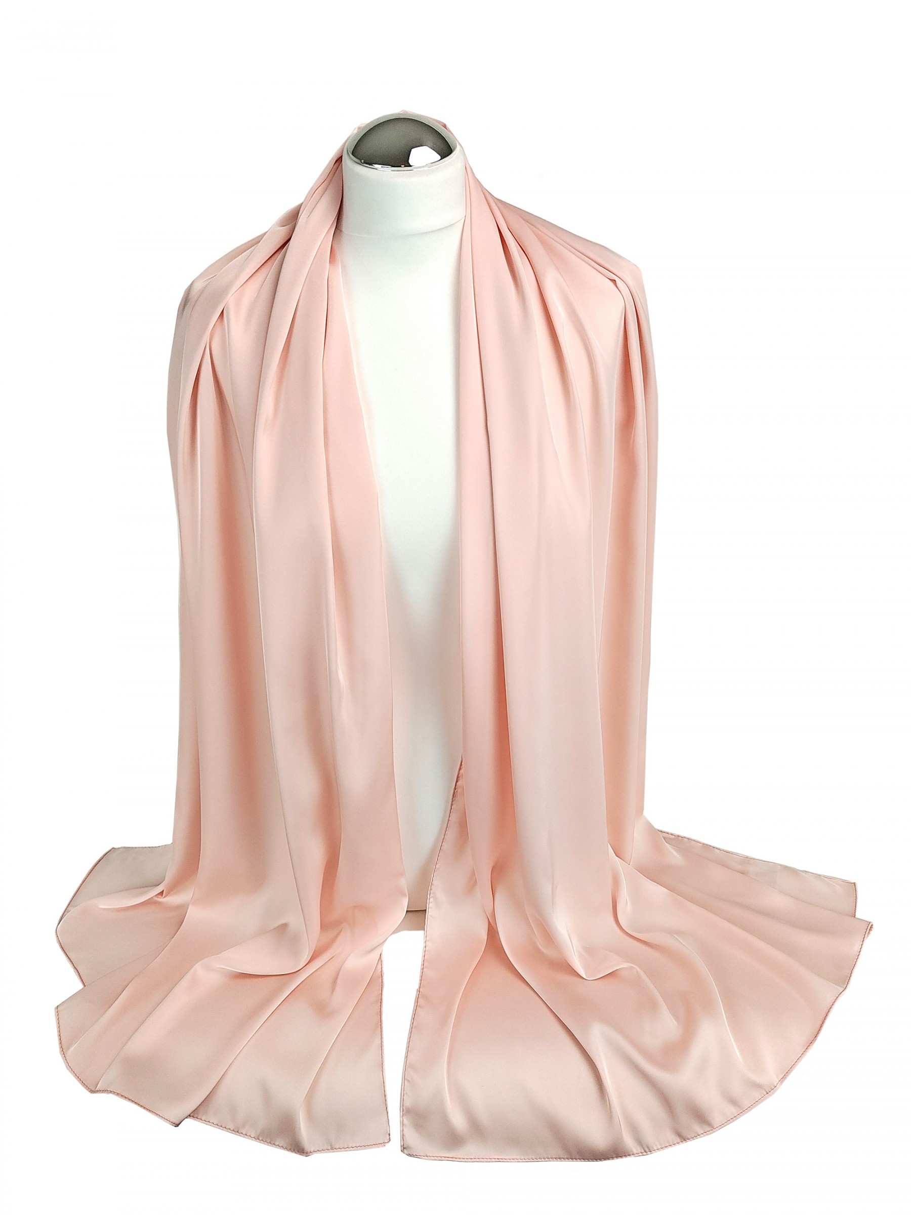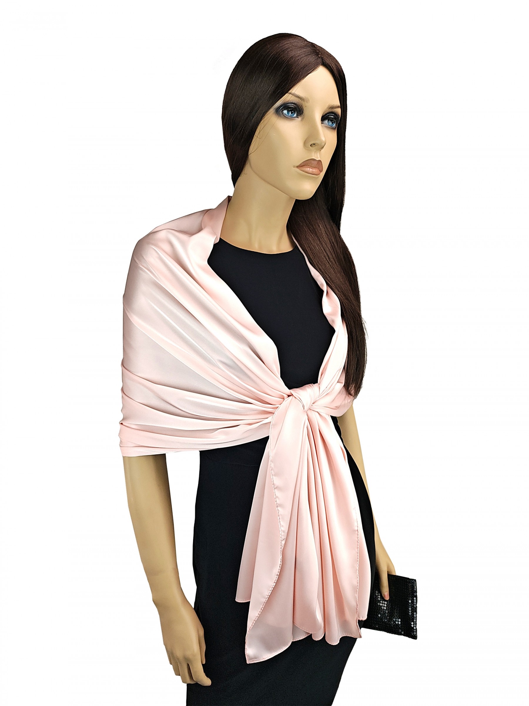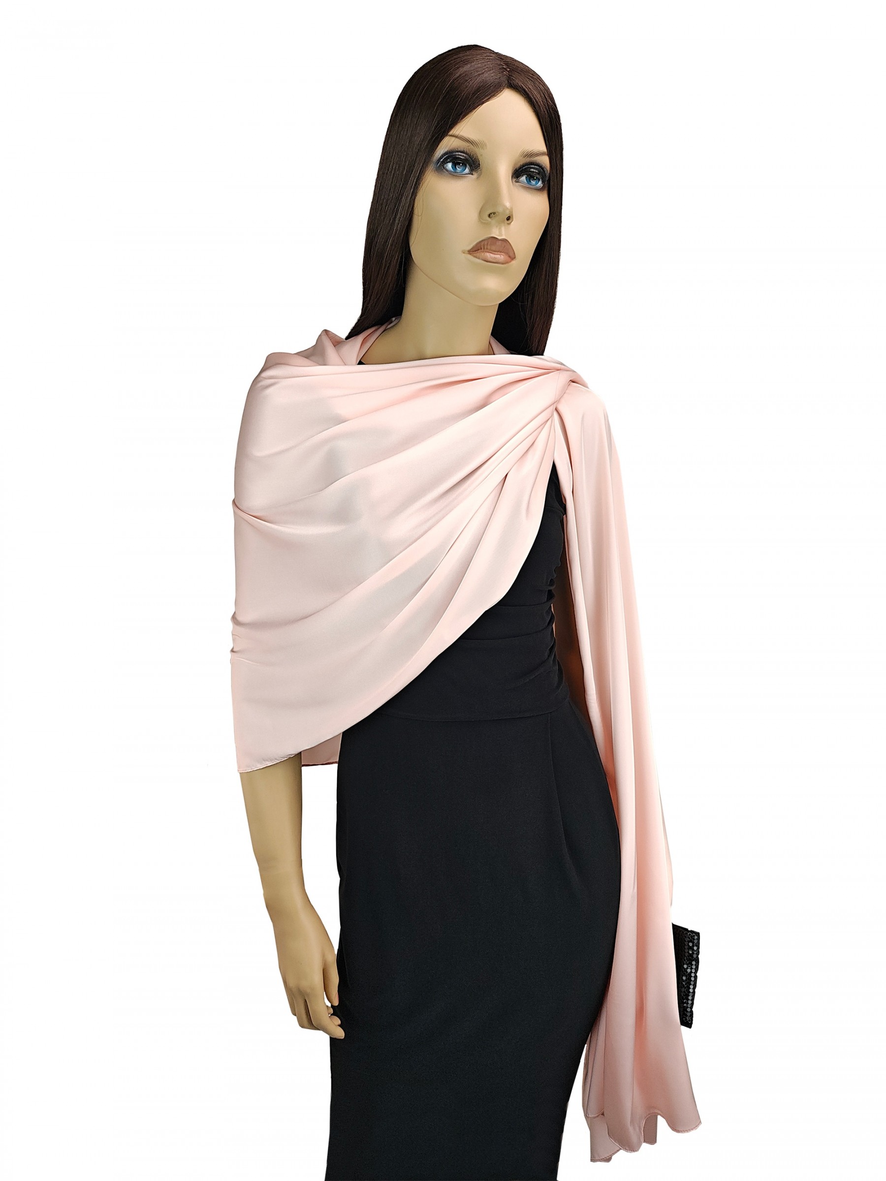 Poszukujesz eleganckiego satynowego szala do sukienki? W tym subtelnym szalu w pięknym odcieniu pudrowego różu będziesz wyglądała zjawiskowo, jest niezwykle elegancki i kobiecy. Otocz się satynowym blaskiem, który wspaniale podkreśli uroczysty charakter stylizacji.